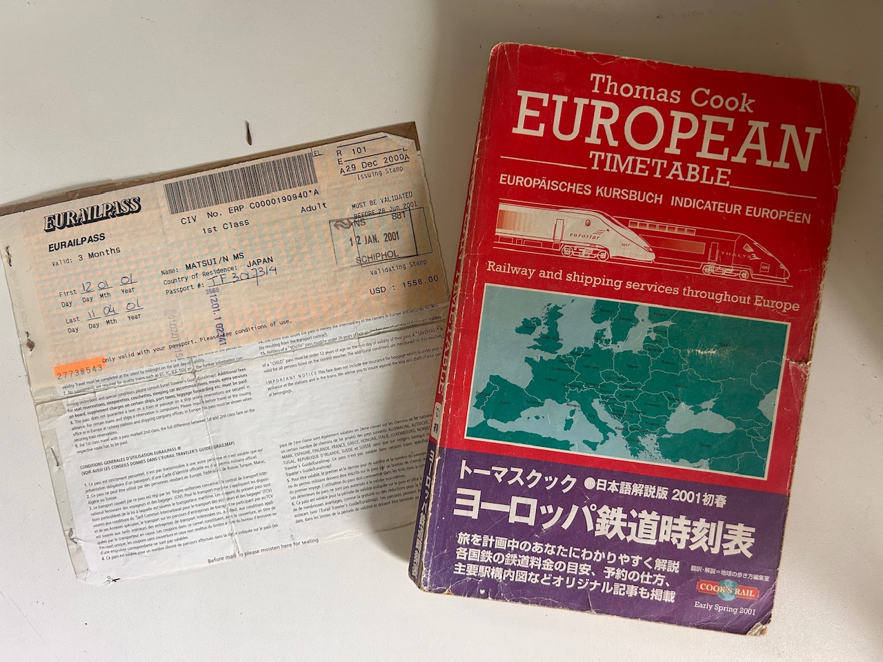 【モノ】薬各種、重要書類のコピー、つぶしたトイレットペーパー×2、洗濯ロープ(ほとんど使わなかった)、ライター(必要なし)、アーミーナイフ(お守りとしてプレゼントしてもらった。公園でパンやチーズ食べるとき重宝)、プラスチックカップ(蓋つき)、デジカメ、電池(デジカメ用。今みたいにUSBで充電なんて知りもしない)、S字フック(ほとんど使わなかった)、洗濯用粉洗剤(袋に入れる)、歯磨きセット、爪切り(必須)、石鹸、シャンプーリンス(念のため)、ウェットティッシュ、薄手のバスタオルとタオル×1ずつ、室内スリッパ、アドレス帳(まだ手紙を書く時代だった)、英語辞書、トーマスクック時刻表、5円玉(交流用)、和紙と筆ペン(交流用)