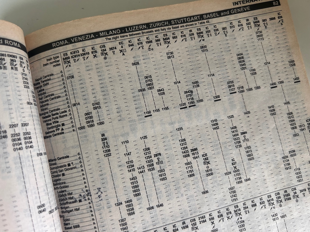 ヨーロッパの鉄道について書かれているトーマスクック時刻表を購入し熟読。
